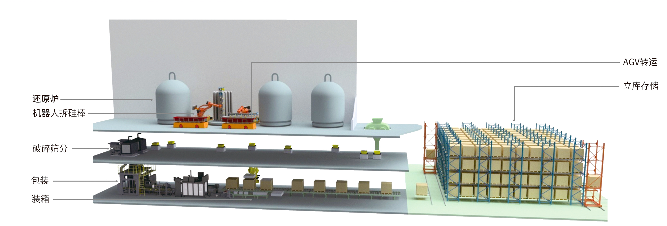 光伏晶体硅后处置惩罚全工业链解决计划涵盖从硅棒获取到产品输出的完整流程。首先举行硅棒洗濯、水淬等加工,随后通过破碎、筛分、磁选等办法完成后续处置惩罚,并包装装箱。最后使用AGV转运和智能仓储系统实现高效物流配送,确保产品质量与交付时效,为光伏晶体硅工业提供一体化效劳支持。